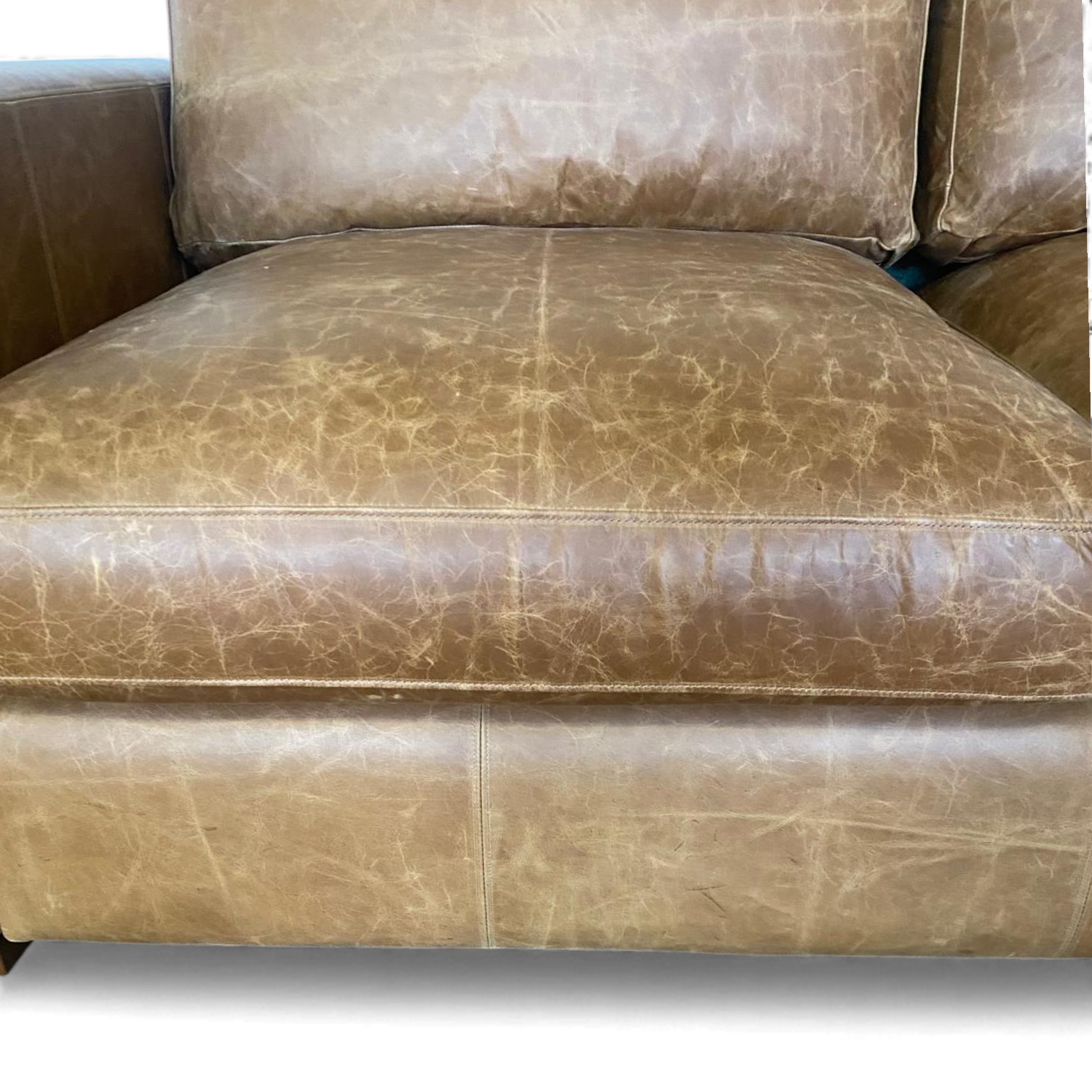 Upholstered in Italian-tanned Distressed Vintage Leather — rich character, softening beautifully with age